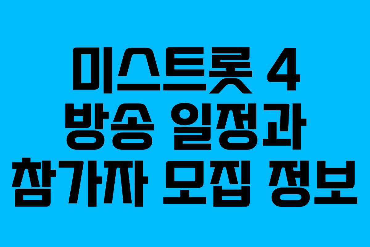 미스트롯 4의 방송 일정과 참가자 모집에 대한 정보가 궁금하신 분들을 위해, 2025년 방송 예정인 미스트롯 4에 대한 자세한 내용을 정리했습니다. 이 글을 통해 방송 일정, 참가자 모집, 예상 출연진 및 투표 방식까지 확인해 보세요.