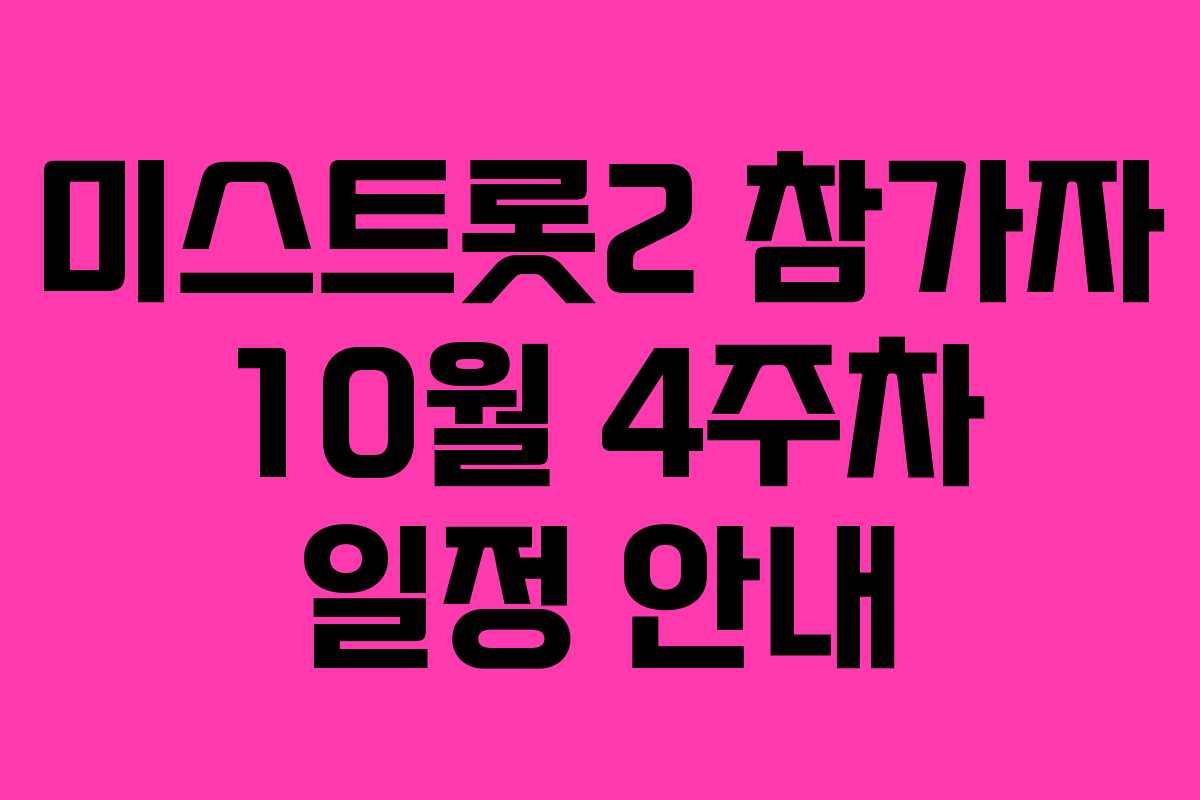 10월 4주차 동안 미스트롯2 참가자들의 다양한 일정이 진행됩니다. 이들은 공연, 라디오 방송, TV 녹화 등에서 활발히 활동하며 팬들과 소통할 예정입니다. 아래에서 각 날짜별로 상세 일정을 살펴보겠습니다.