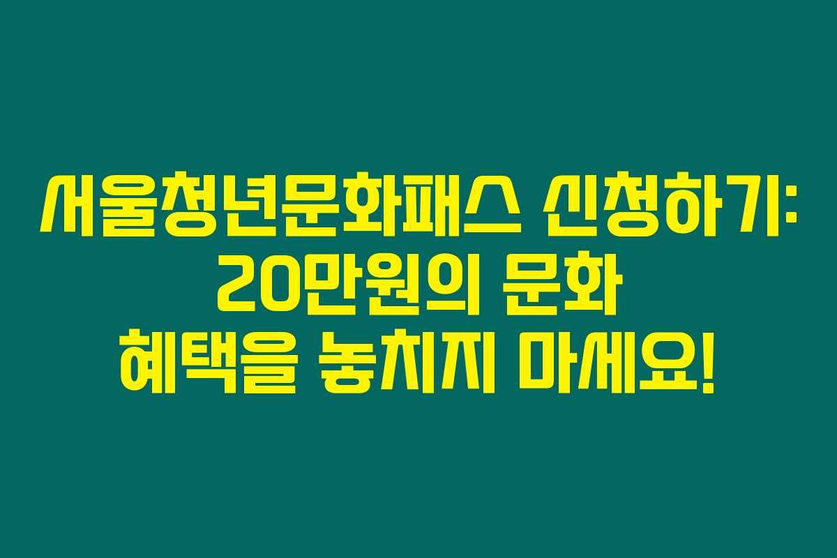 서울청년문화패스는 청년들에게 더 많은 문화예술 경험을 제공하여 풍부한 문화생활을 누리는 기회를 줍니다. 함께 더욱 행복한 문화생활을 즐겨보세요! 이러한 기회를 놓치지 않도록 지금 바로 신청하세요!