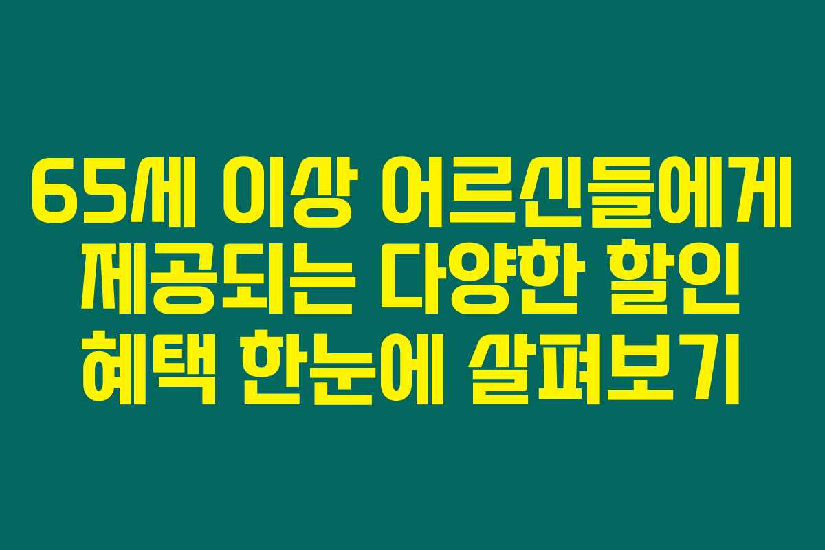 제가 직접 리서치한 바로는, 65세 이상의 어르신들을 위한 다양한 할인 혜택이 정부와 민간 부문에서 폭넓게 제공되고 있어요. 이 혜택들은 교통비, 문화생활, 건강, 생활 전반에 걸쳐 있어 고령층의 경제적 부담을 줄여주고 보다 편리한 삶을 영위할 수 있도록 도와줍니다. 아래를 읽어보시면, 각 할인 혜택의 종류와 신청 방법, 유의사항에 대해 자세히 알아볼 수 있습니다.