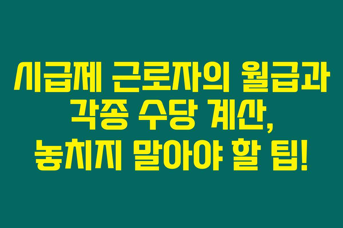 저는 직접 확인해본 결과, 시급제 근로자의 월급과 각종 수당을 정확히 계산하는 방법을 아래를 읽어보시면 자세히 설명드리겠어요. 시급제 근로자로 일하는 여러분 중 일부는 자신의 급여가 정확하게 지급되고 있는지 불안감을 느낄지도 모르겠어요. 이런 걱정을 덜기 위해 어떻게 계산하는지, 각 수당을 어떻게 처리하는지 알아보는 것이 중요하답니다.