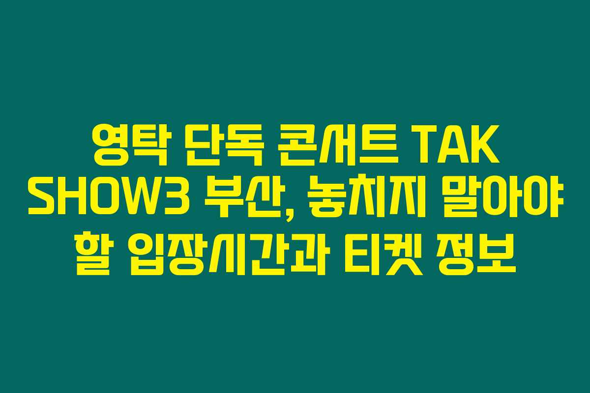오늘 전해드린 정보를 통해 영탁의 TAK SHOW3 부산 콘서트를 시원하게 즐기시길 바랍니다. 공연이 얼마 남지 않았지만, 철저한 준비와 신중한 관람으로 멋진 시간을 만끽하세요!