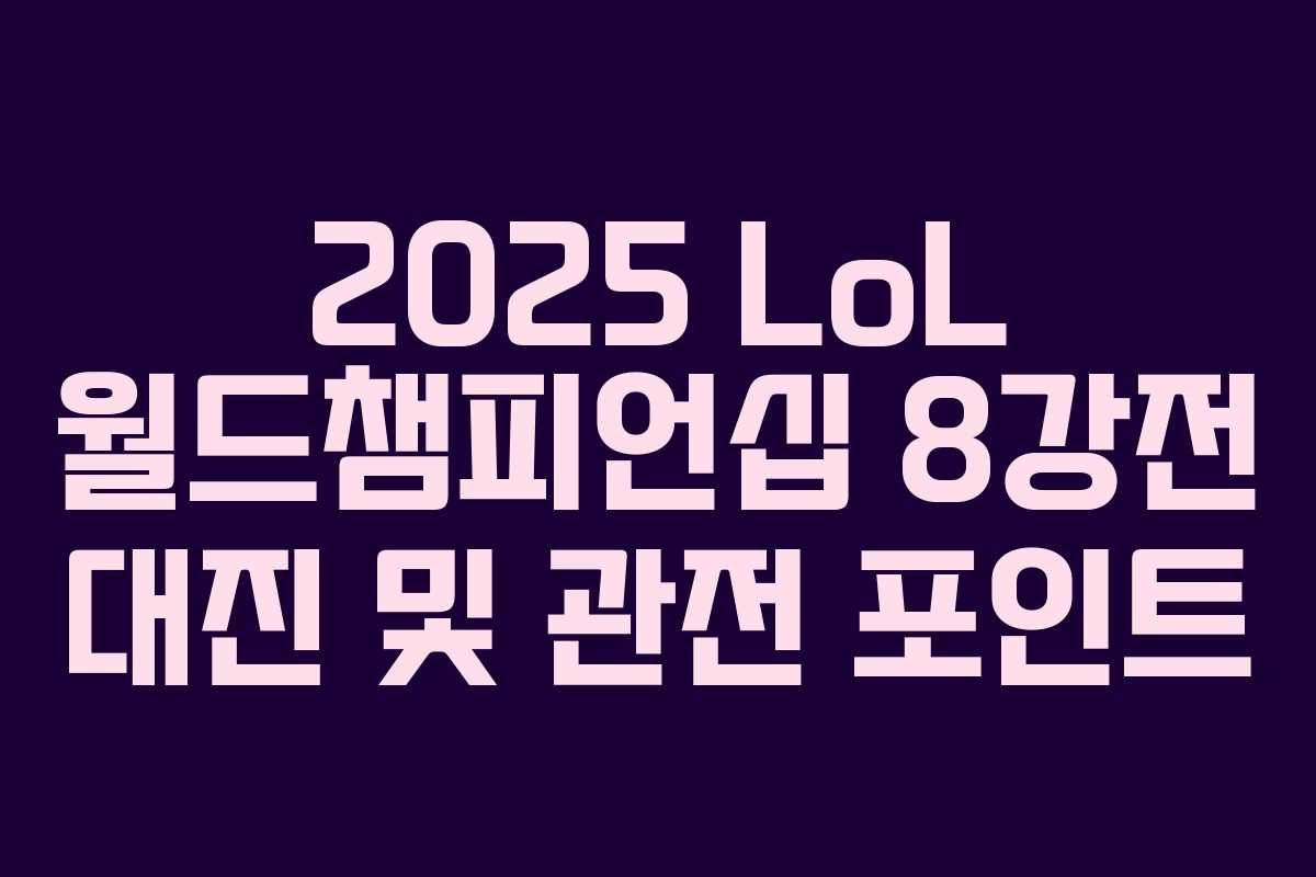 2025 롤드컵 8강전은 10월 17일부터 10월 27일까지 프랑스 파리의 아디다스 아레나에서 진행됩니다. 모든 경기는 5판 3선승제로 진행되며, 패배하는 팀은 즉시 탈락하는 구조입니다.