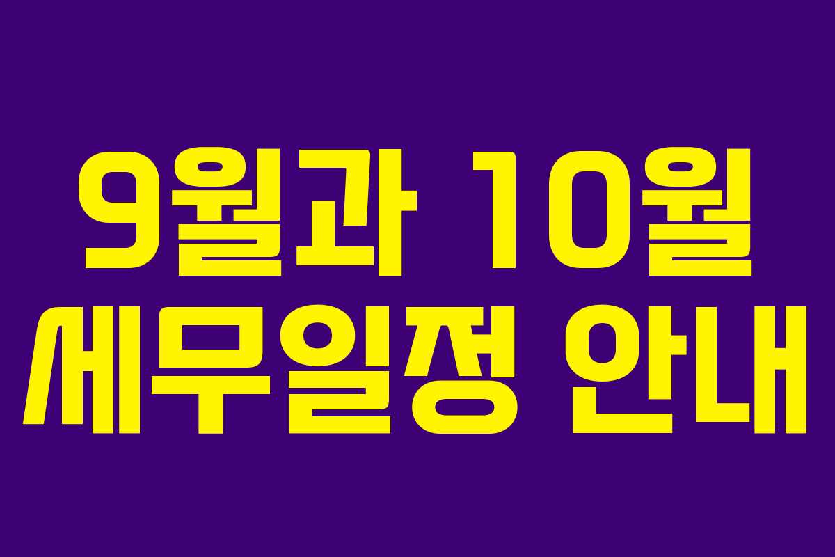 세무 업무를 원활하게 수행하기 위해서는 정확한 세무일정을 파악하는 것이 매우 중요합니다. 9월과 10월의 주요 세무일정을 정리하여 드리겠습니다.